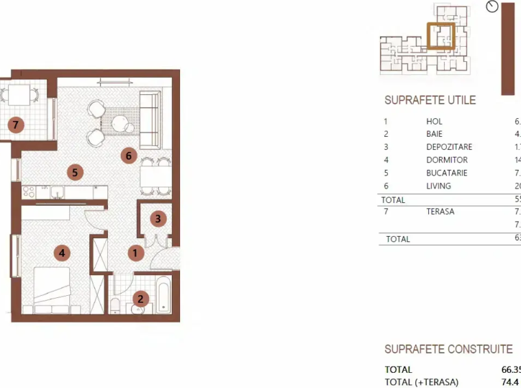Acest apartament de 2 camere este situat la etajul 1 al unui imobil nou, de tip boutique (regim mic de înălțime), localizat pe strada Gheorghe Țițeica. Proprietatea are o suprafață utilă de 55.30 mp, completată eficient de o terasă de 7.71 mp. Locuința beneficiază de compartimentare inteligentă și finisaje premium, incluzând tâmplărie de aluminiu, parchet triplu stratificat, placări ceramice Marazzi/Porcelanosa și obiecte sanitare Roca. Confortul termic este asigurat prin încălzire în pardoseală și climatizare tip duct, iar fațada ventilată garantează o eficiență energetică superioară.