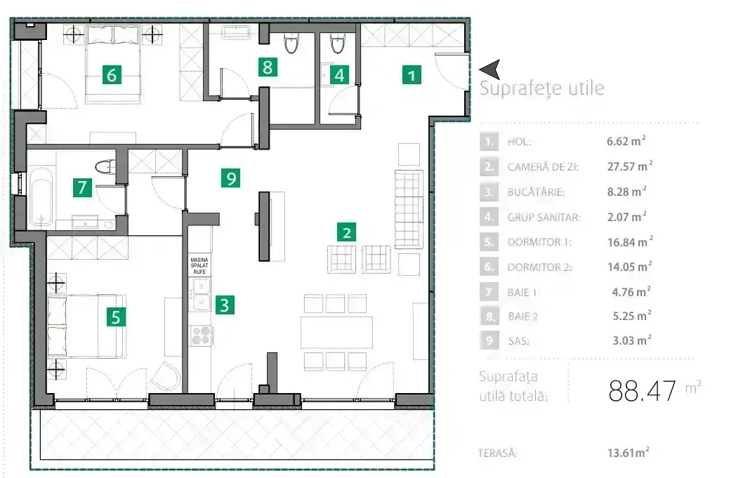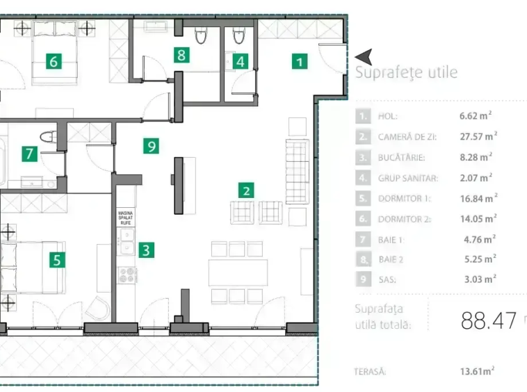 Compartimentare: decomandată, oferind intimitate și funcționalitate