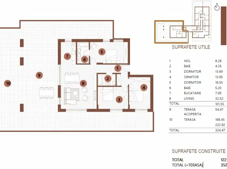 Elementul care scoate cu adevărat în evidență această proprietate este suprafața teraselor. Cu o terasă acoperită de aproape 55 mp și o terasă deschisă colosală de peste 168 mp, aveți la dispoziție un spațiu exterior total de peste 220 mp. Este locul unde puteți organiza evenimente memorabile, unde copiii se pot juca în siguranță sau unde vă puteți crea propria grădină suspendată, totul sub cerul liber, chiar deasupra orașului.