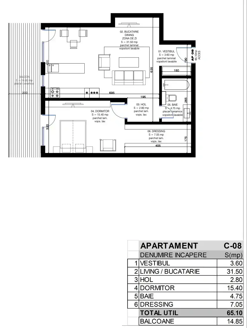 Apartamentul are o suprafață utilă de 65 mp, este excelent compartimentat și beneficiază de un avantaj rar în zonă: grădină proprie de 43 mp, perfectă pentru relaxare, joacă, zonă verde sau dining exterior.