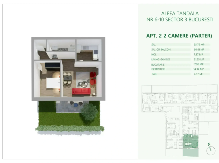 Vă invităm să descoperiți un apartament cu adevărat special, situat într-un ansamblu rezidențial nou . Cu o suprafață utilă de 55,79 mp și o curte privată de 34,82 mp, această locuință oferă echilibrul perfect între confortul unui apartament modern și intimitatea unei grădini personale.