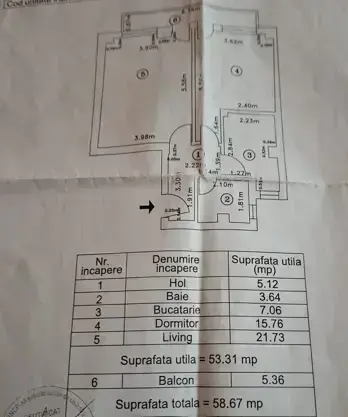De vanzare apartament cu 2 camere, decomandat, bucatarie inchisa, balcon inchis 5,36 mp cu acces din livingroom si dormitor. Apartamentul are suprafata utila totala 58,67 mp.