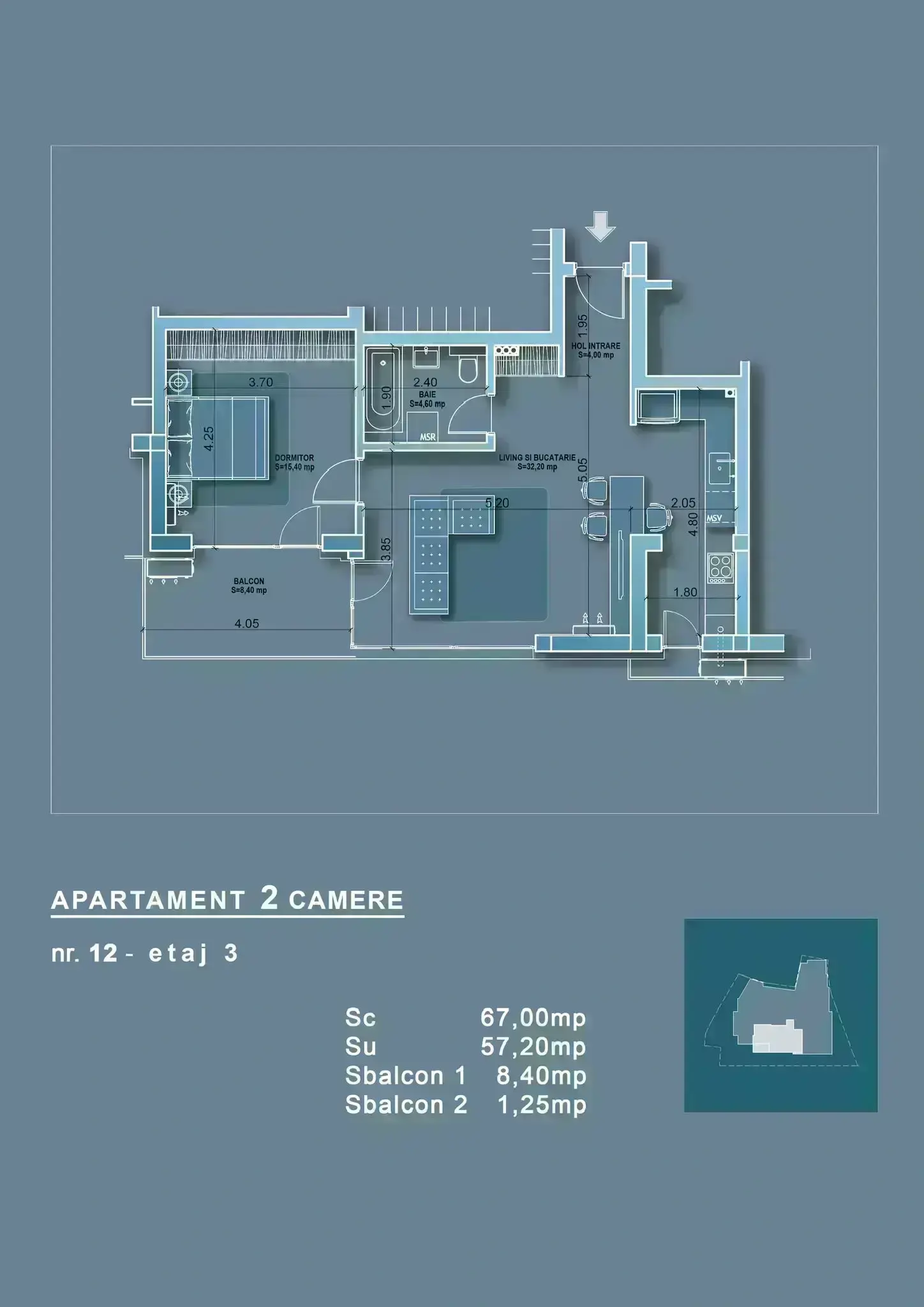 Suprafață: 66 mp din care balcon de 8 mp+ balcon 1 mp