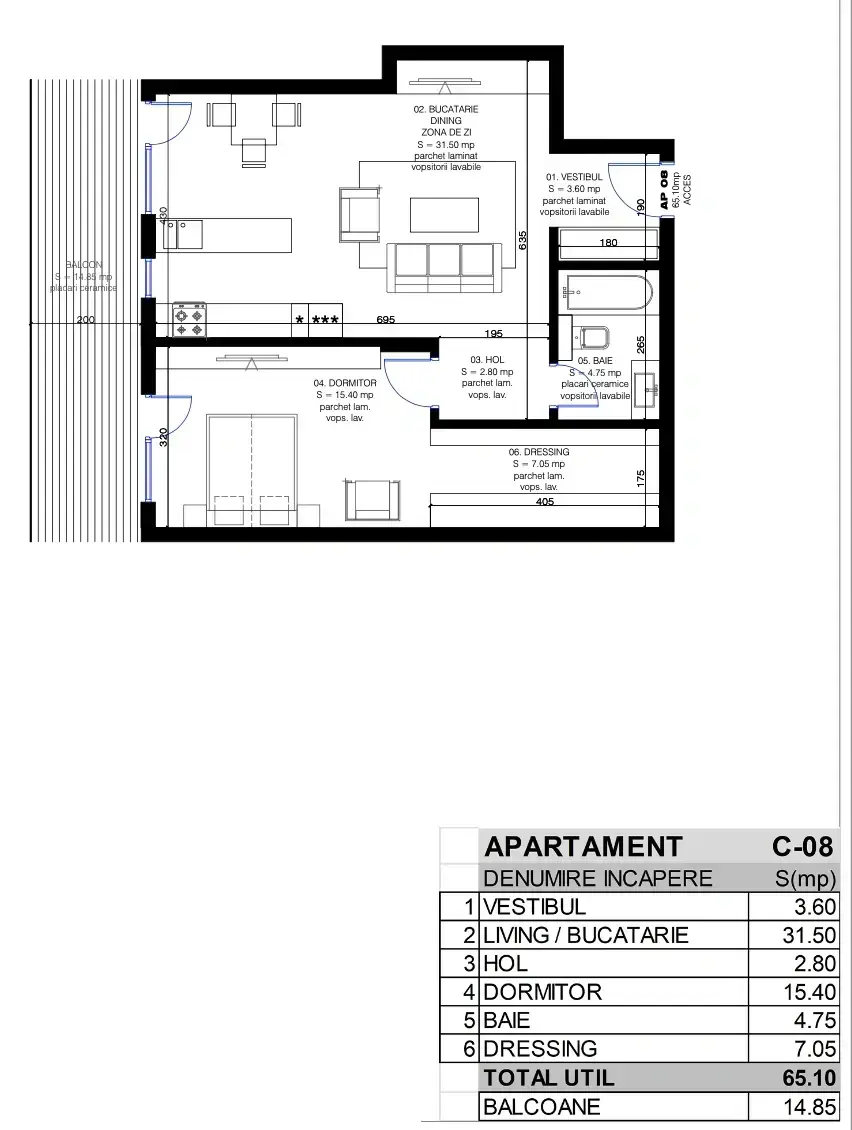 Apartamentul este amplasat la etajul 1 al unui imobil nou, cu regim redus de înălțime, și are o suprafață utilă de 65 mp, la care se adaugă o terasă generoasă de 15 mp, perfectă pentru relaxare, zonă verde sau dining exterior.