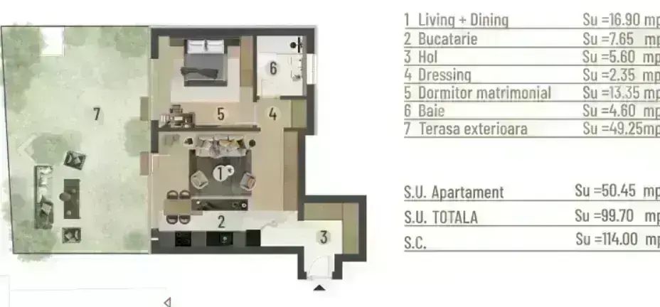 Apartamentul dispune de o terasa, oferind un spațiu suplimentar pentru relaxare și activități în aer liber.
