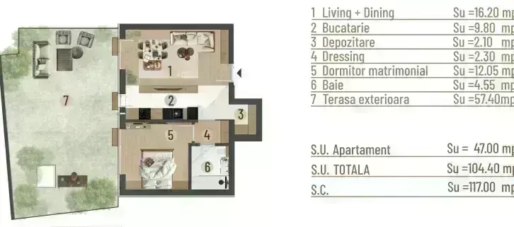 Va propunem spre vanzare ultimul aparatament cu 2 camere sut 104,40 mp din care terasa 57,40 mp situat la parterul unui imobil nou cu regim de inaltime S+P+5+7R.