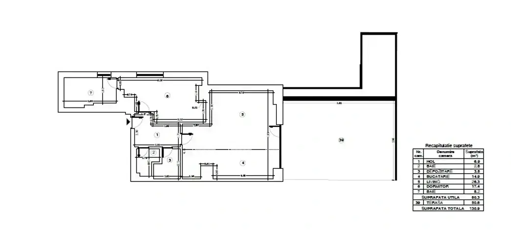 Apartamentul cu două camere, decomandat, și bucătărie open space, având o suprafață utilă totală de 130,90 mp, dintre care terasa de 50,60 mp oferă un avantaj considerabil. Această dimensiune generoasă permite nu doar o amenajare confortabilă și practică în interior, dar și crearea unui spațiu exterior plăcut, ideal pentru relaxare sau petrecerea timpului cu cei dragi.
