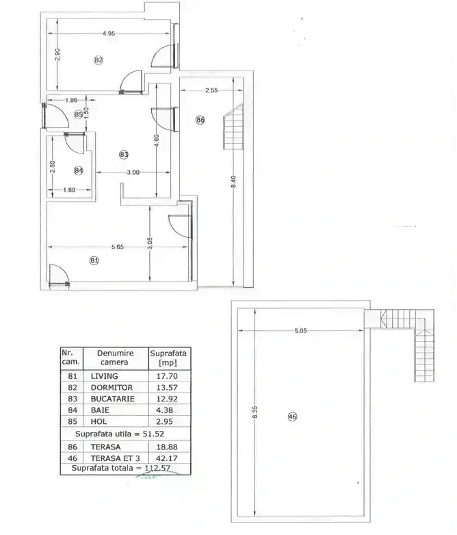 Apartamentul are suprafata utila totala 112,57 mp din care terasa 42,17 mp. si balcon 18,88 mp Finisajele și băile complet echipate sunt un mare avantaj, iar faptul că actele sunt deja pregătite pentru semnarea contractului face procesul de mutare mult mai simplu.
