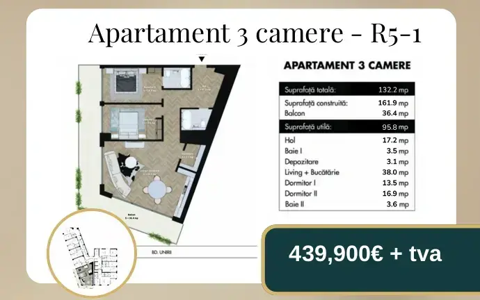 Tipul de apartament cu 3 camere propus spre vanzare mai este disponibil la etajul 1 si 3 al imobilului cu regim de inaltime S+P+6E-11E si beneficiaza de o suprafata utila totala de 161,90 mp, din care 36,40 mp terasa de care beneficiaza fiecare camere. Livingul +bucataria de 38 mp creeaza un spațiu deschis, unde se poate amplasa o canapea orientată spre zona de relaxare, iar în apropiere, zona de luat masa. O insulă sau bar de bucătărie poate acționa ca un element de separare și totodată funcțional dand spatiului un ambient sofisticat si modern.