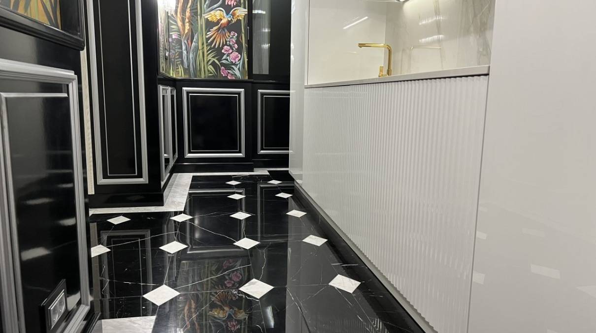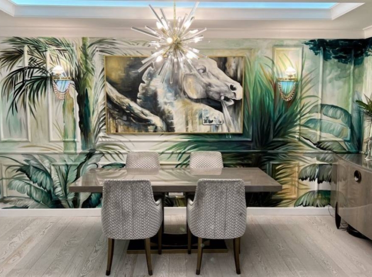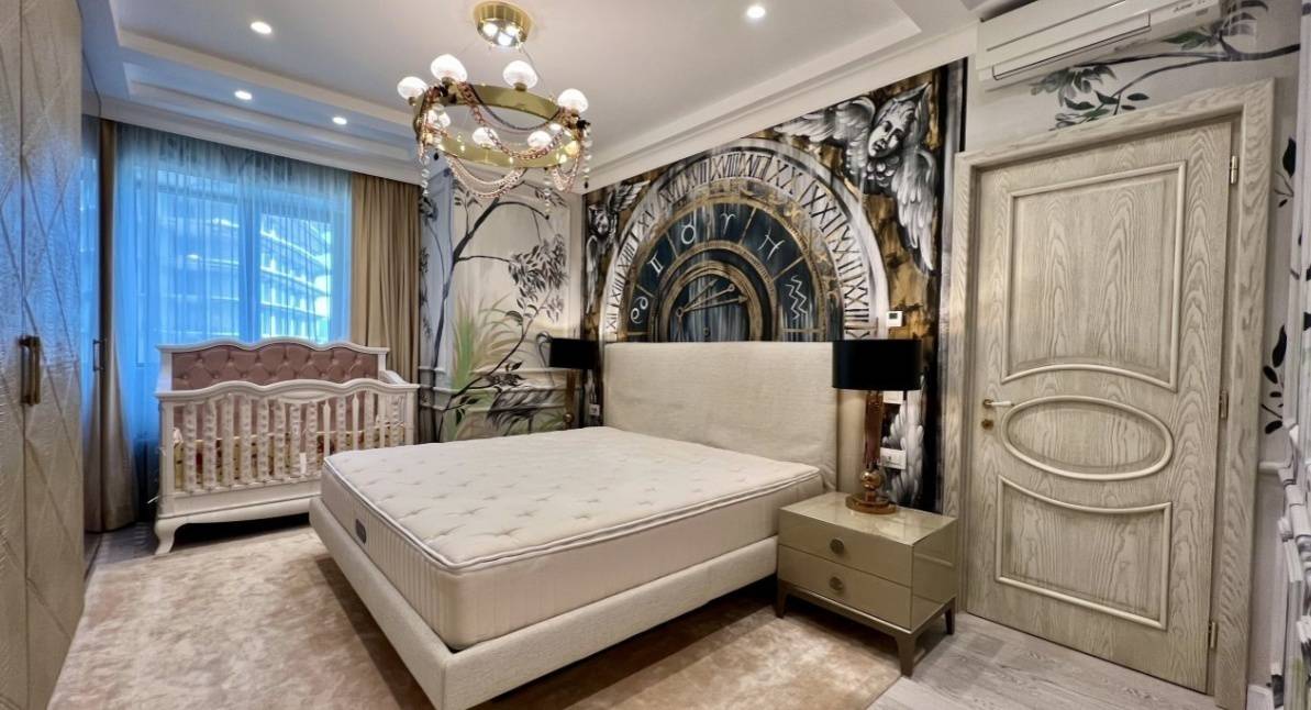 The interior of the apartment is a mixture of classical and contemporary influences, as evidenced by the furniture designed to order and the decoration of the walls hand-painted by a famous Italian painter, collaborator of the CIAC group, who lives his life as a work of art.