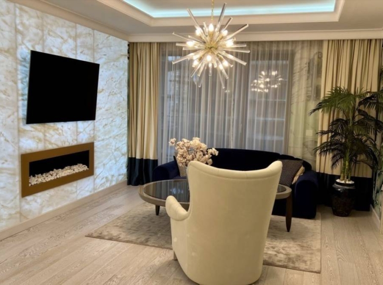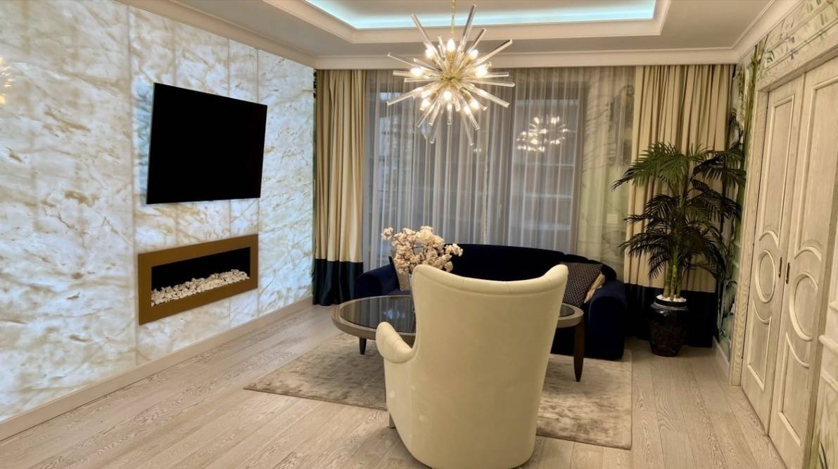 It has a comfortable lounge with a sofa and armchair set and a huge flat screen TV, attached to a wall of semi-precious Onyx White stone, lit with an integrated bio-ethanol fireplace.