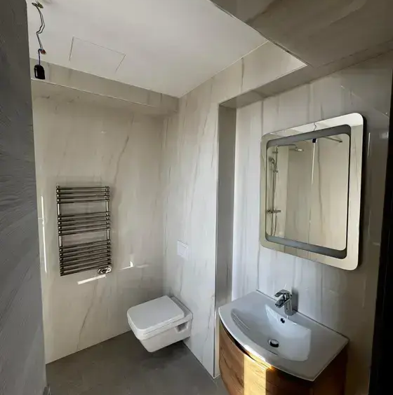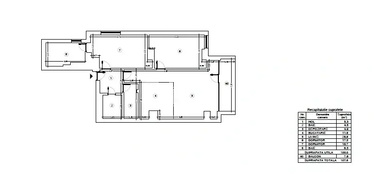 Apartamentul se întinde pe o suprafață utilă de 100 metri pătrați, la care se adaugă un balcon generos de 7.6 metri pătrați, totalizând 107.6 metri pătrați de spațiu privat. Compartimentarea inteligentă cuprinde 3 camere spațioase, două băi complet echipate și o bucătărie deschisă, ce oferă un cadru ideal pentru gătit și socializare.