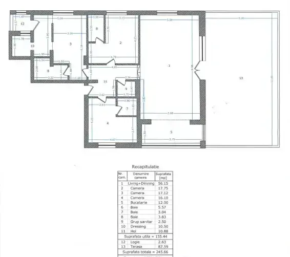 Vă pot prezenta un apartament cu 4 camere suprafata totala 245,65 din care terasa 87,58mp si 2,63mp logie, decomandat, al cărui spațiu generos permite o amenajare interioară deosebită și confortabilă ( living+dinning 56,15 mp). Fiecare cameră beneficiază de lumină naturală, iar designul inteligent al interiorului facilitează o organizare eficientă a mobilierului.