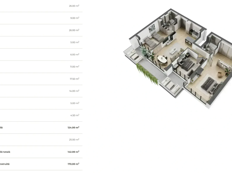 Cu o suprafață utilă totală de 142 mp, dintre care 25 mp de terasă generoasă, apartamentul oferă un echilibru perfect între spațiu, lumină și funcționalitate.