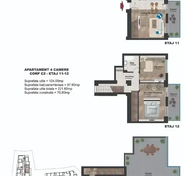 Va prezentam unul din ultimele 3 apartament tip duplex cu 4 camere, situat la etajul 11-12 cu o suprafata utila totala 214,17 mp din care 2 balcoane + terasa 77,05 mp.