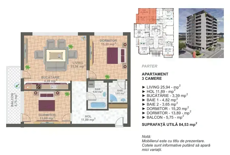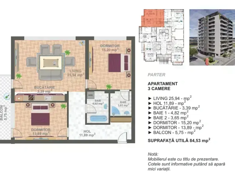 Apartamentul are o suprafață totală de 84.53 mp, din care 5.75 mp reprezintă logia, ideală pentru momente de relaxare, situat la etajul 4 si beneficiaza de o vedere libera.