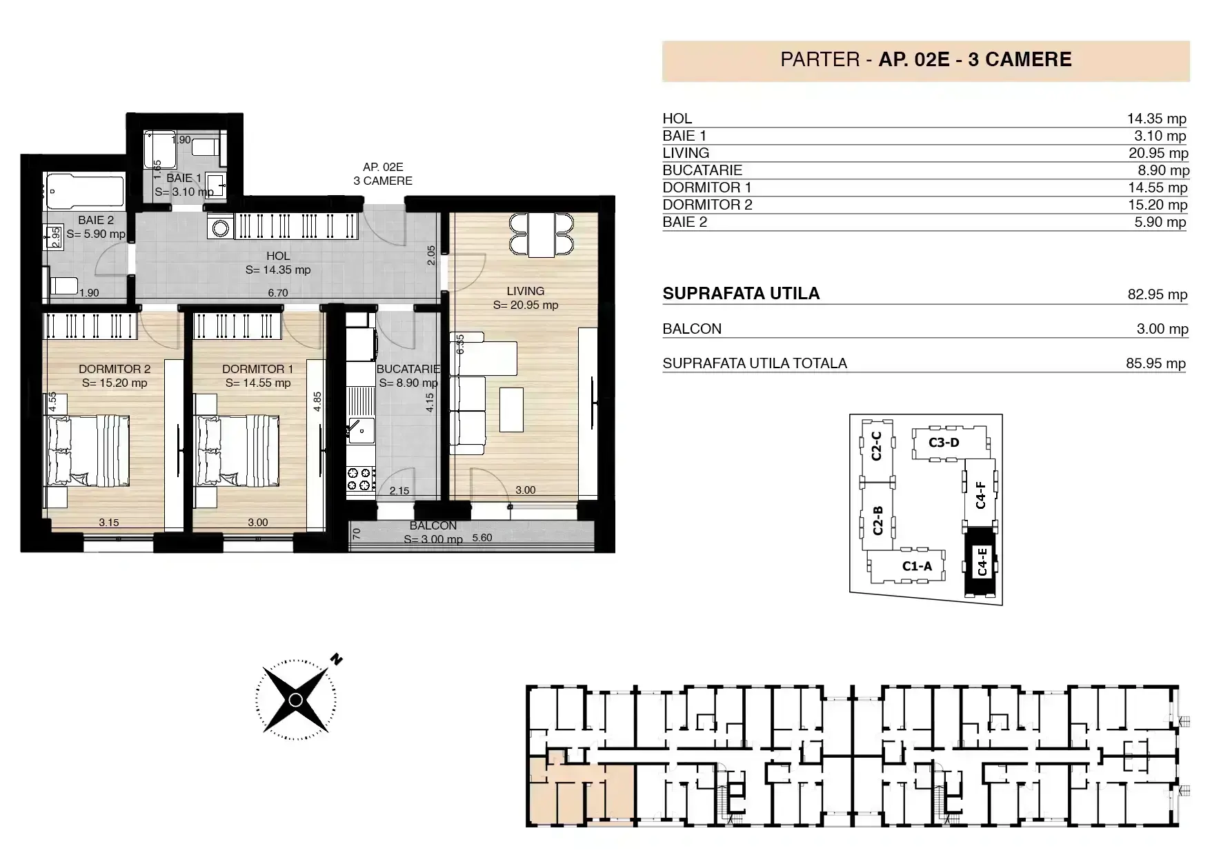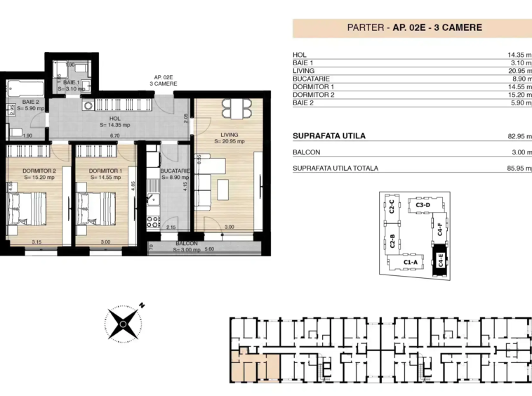 Acest apartament spatios, in cadrul unui ansamblu rezidențial premium, amplasat într-o zonă liniștită, dar cu acces facil către punctele importante ale orașului, beneficiaza de spatii luminoase si aerisite, bucatarie inchisa, compartimentare foarte buna, living, hol, 2 dormitoare mari, 2 bai si un balcon.