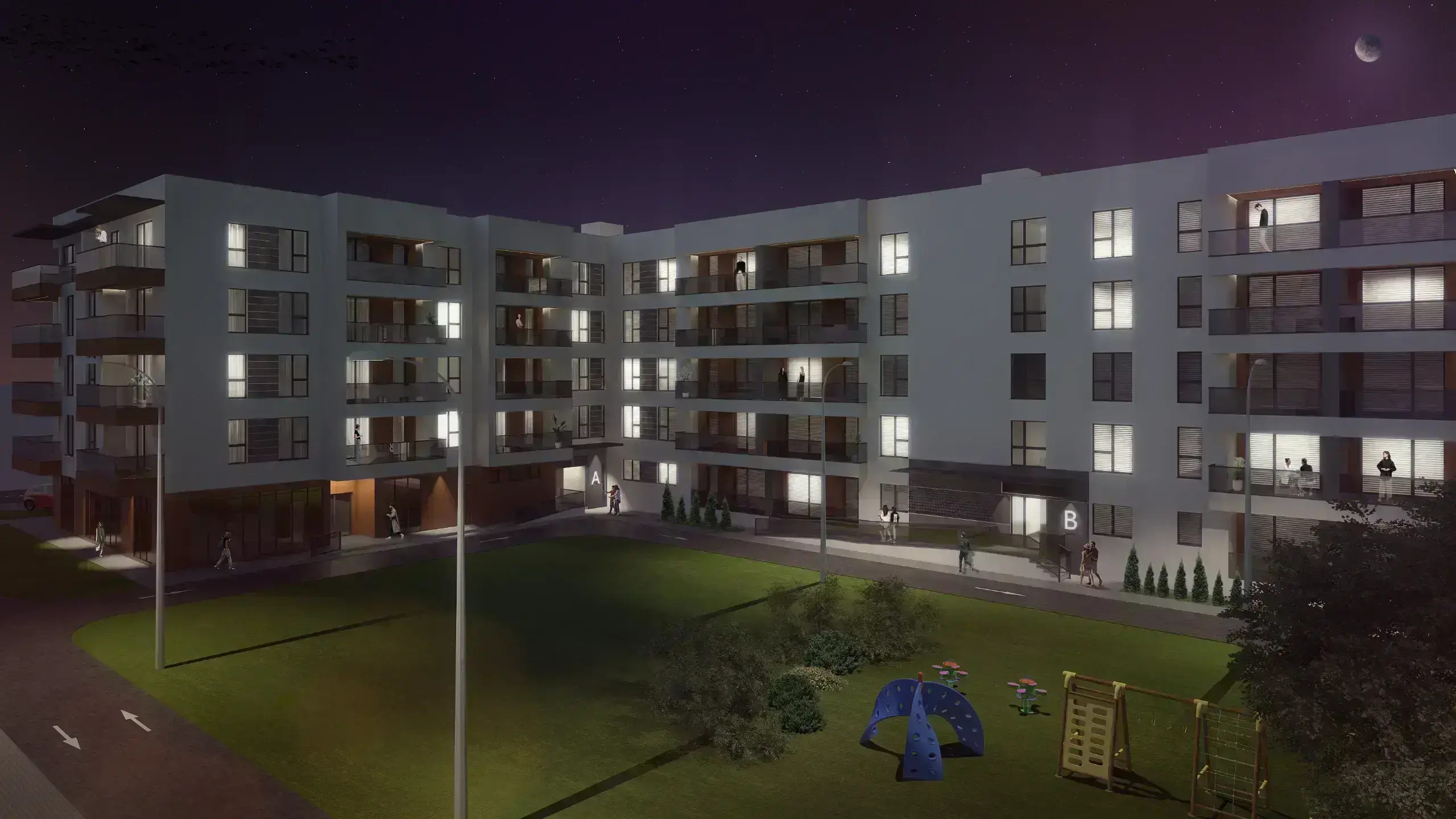 In cadrul proiectului gasim spații verzi amenajate și locuri de joacă pentru copii, care creează un mediu ideal pentru familii.