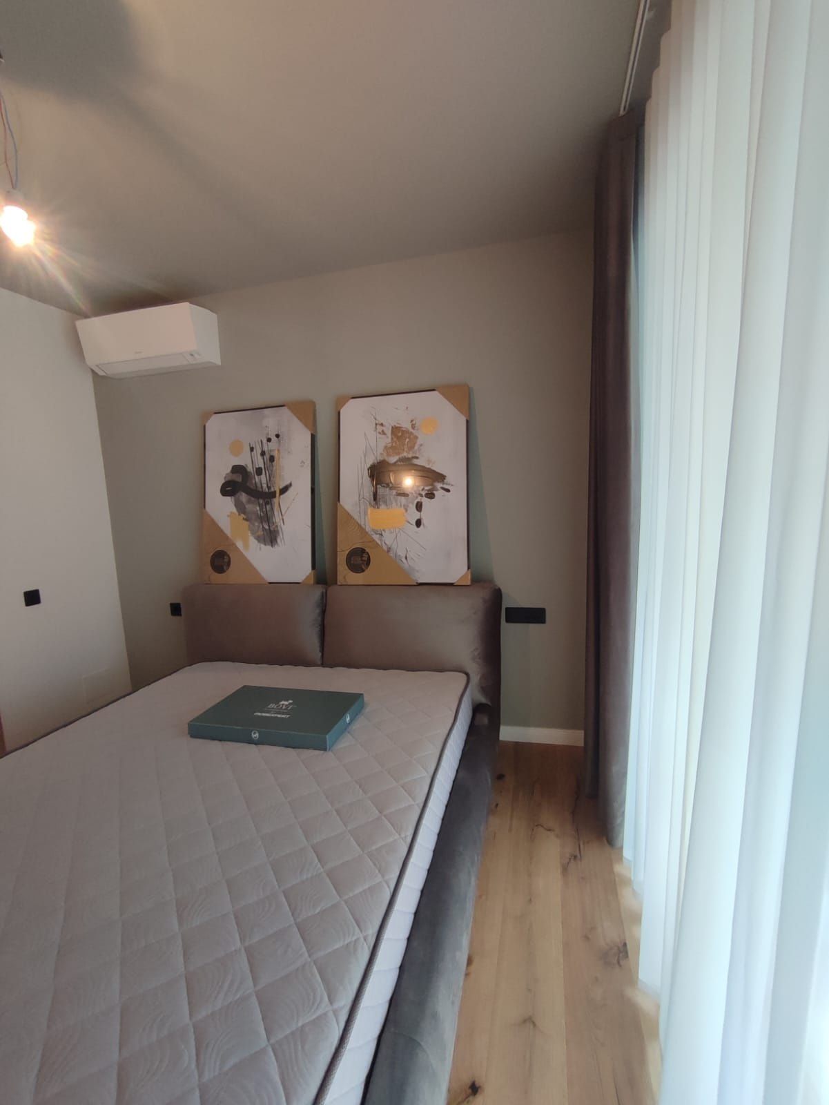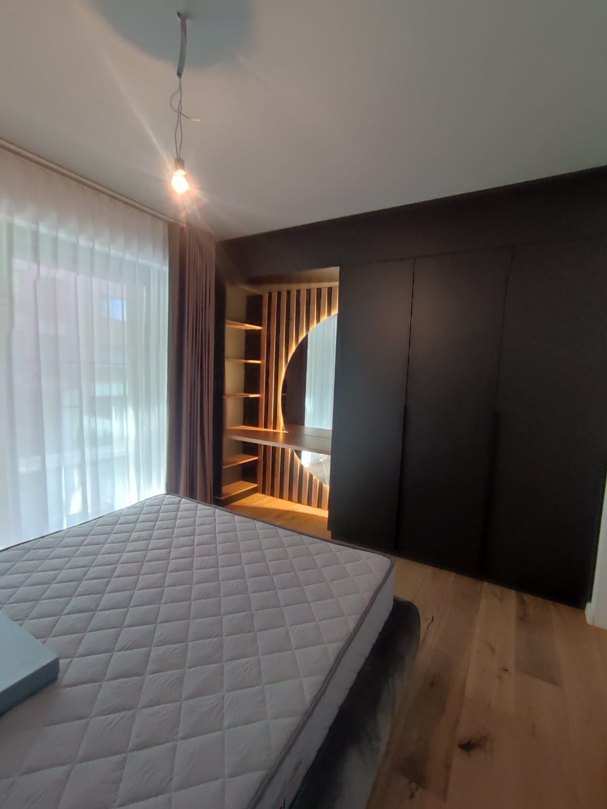 Pardoseala este placată cu parchet triplu stratificat în camerele de tip living/dormitor/hol.