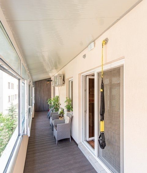 Balconul spațios a fost inteligent reamenajat pentru a maximiza eficient utilizarea fiecărui metru pătrat. În prezent, acesta găzduiește o sală de sport acoperită, o zonă intimă de relaxare cu masă și scaune, precum și două dulapuri încăpătoare, special concepute pentru depozitarea obiectelor.