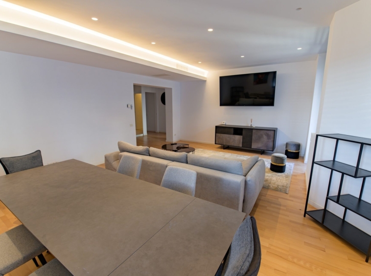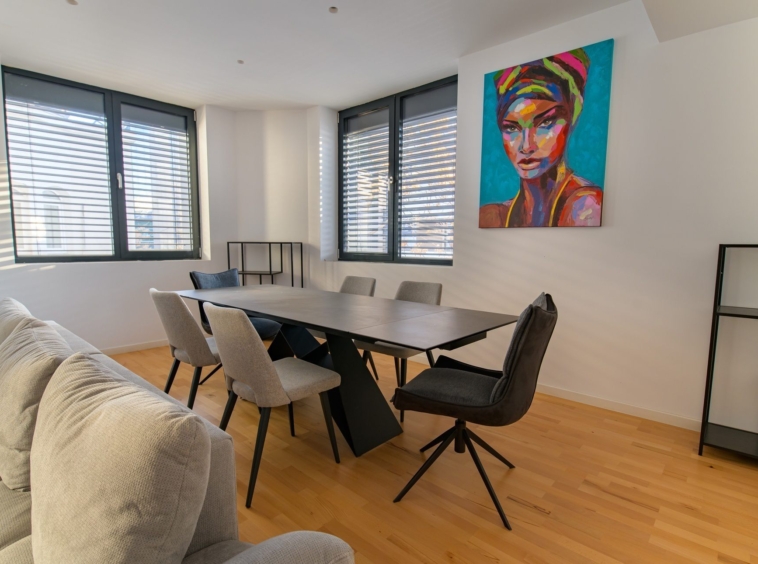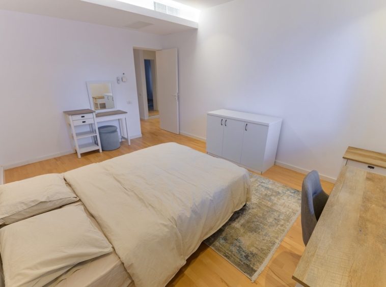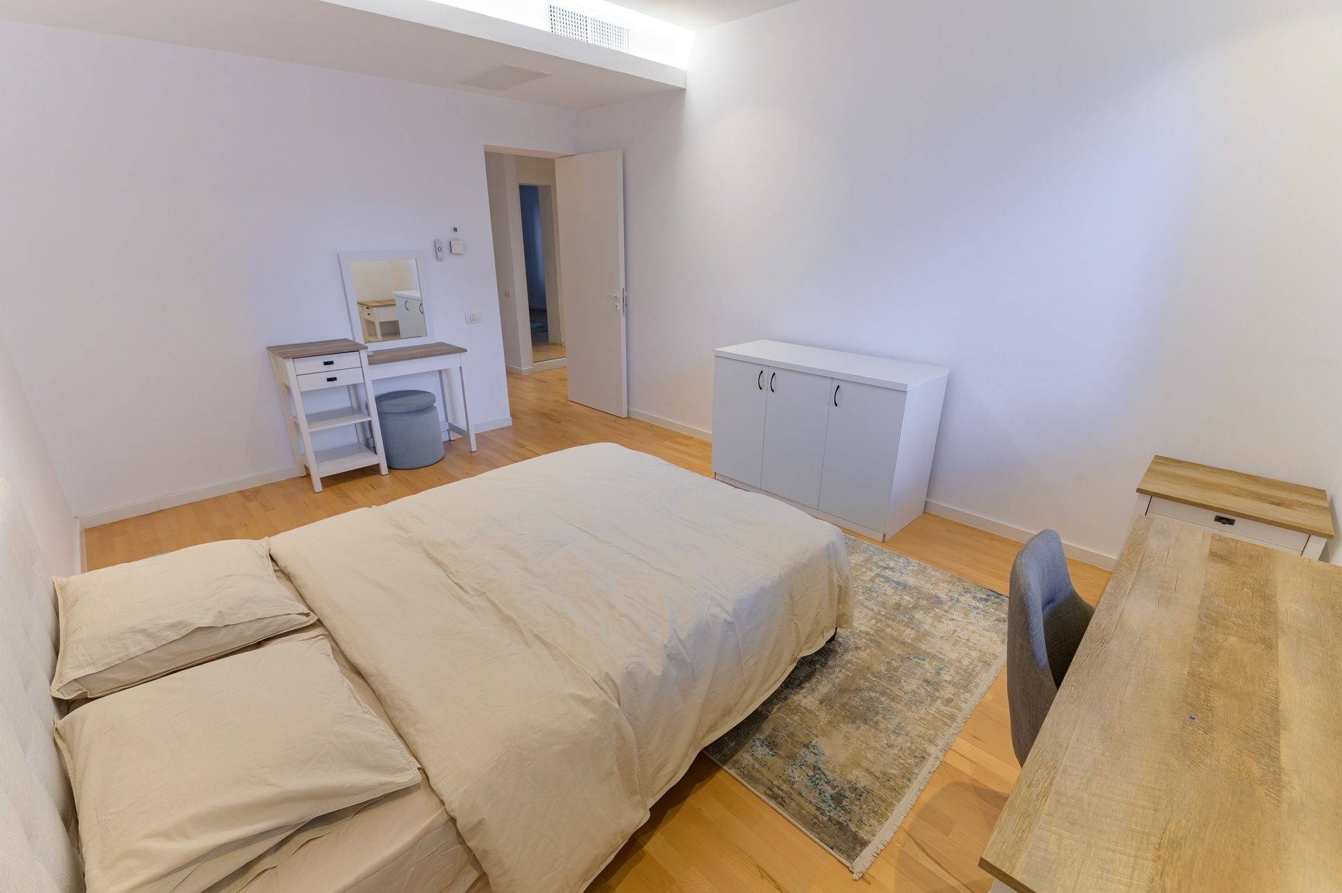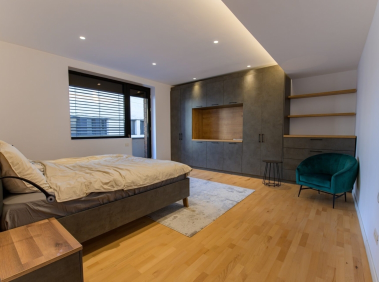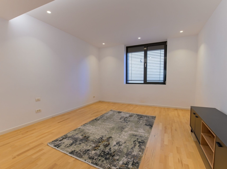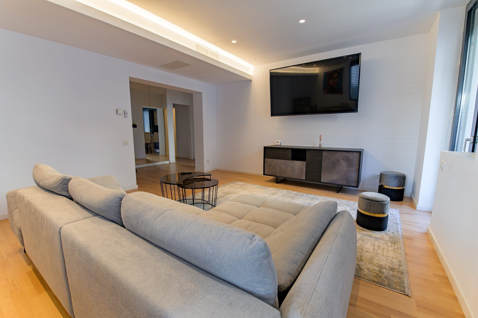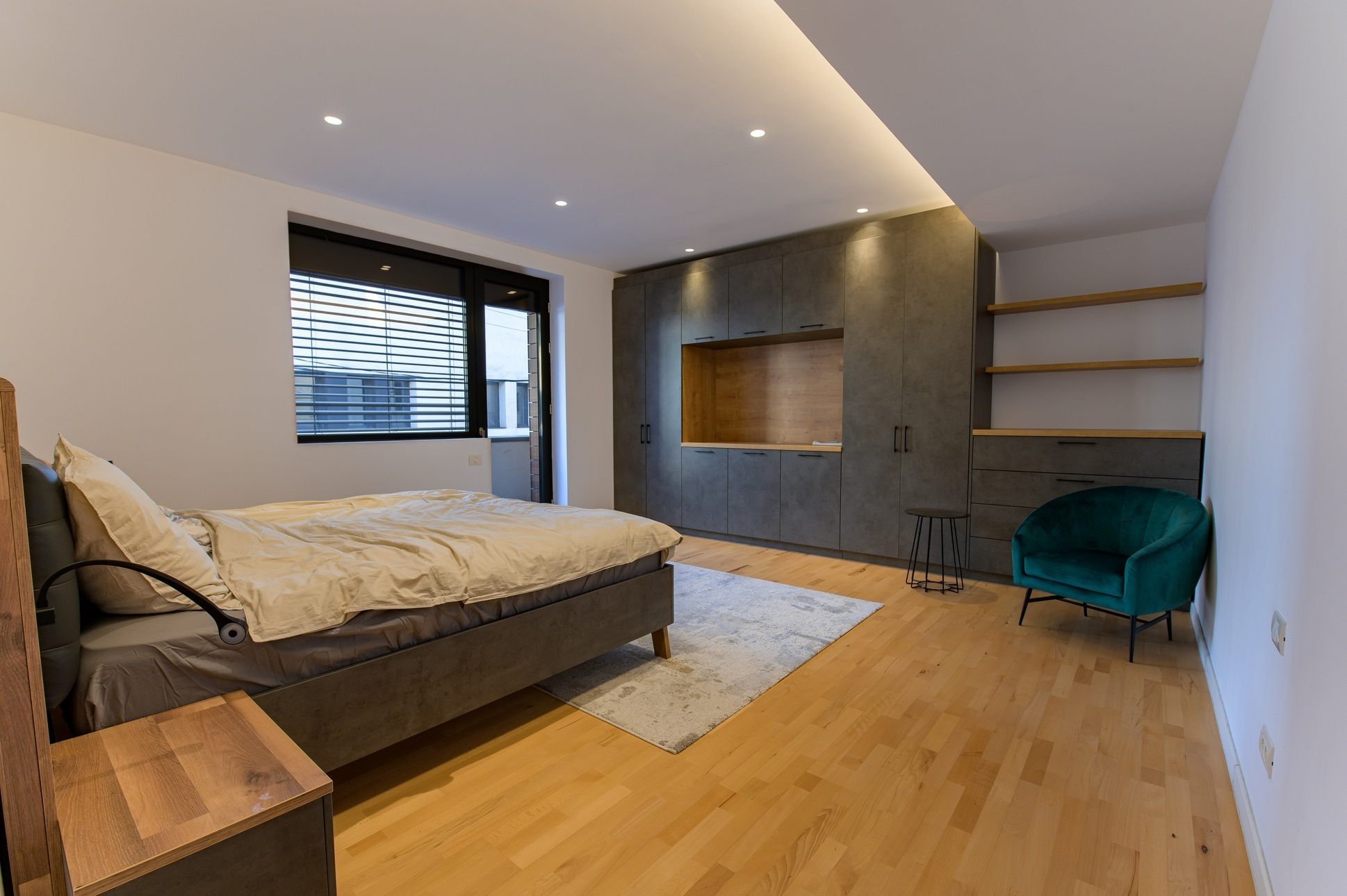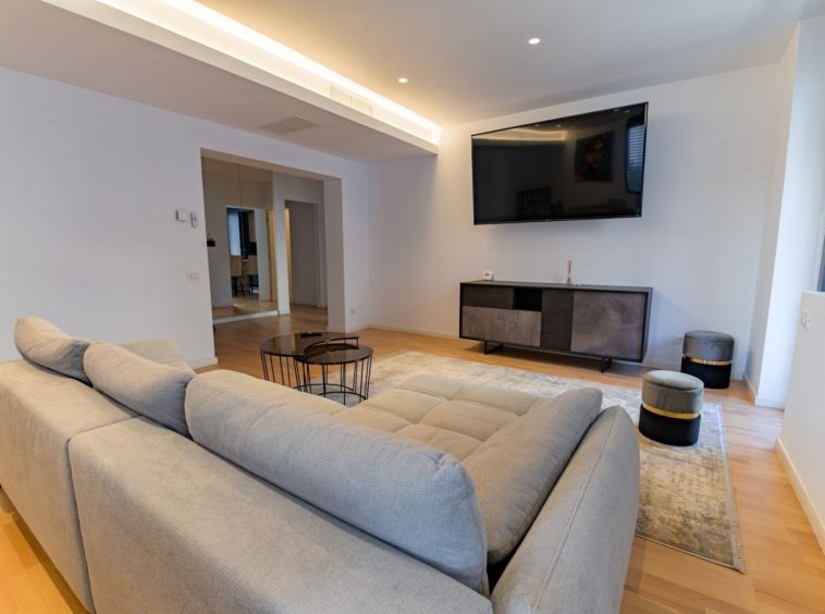 Mobilierul personalizat și parchetul din lemn masiv aduc un plus de rafinament și confort ambientului. Beneficiind de dotări moderne precum încălzirea prin pardoseală și sistemul de climatizare, apartamentul creează un mediu de trai plăcut și adaptabil.
