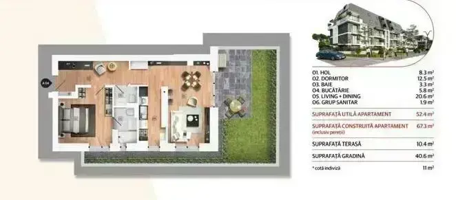Imobilul se afla intr-un bloc de apartamente, construit in anul 2022, la parter/3, detine o suprafata totala de 65 m.p, din care suprafata utila este 53 m.p ,terase in suprafata de 10 m.p si o gradina in folosinta exclusiva de 40 m.p