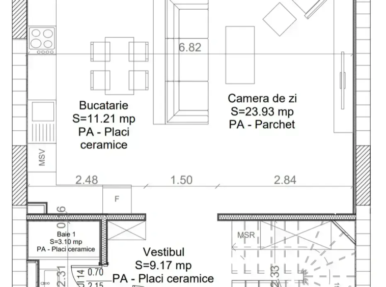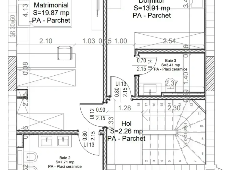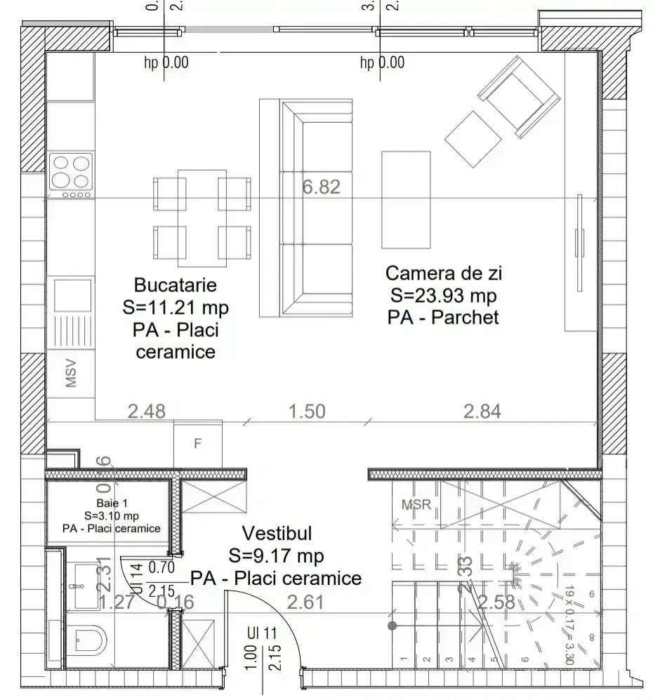 Înălțime camere: 3,00 m în zona de zi și 2,80 m în zona dormitoarelor, oferind o senzație de volum și luminozitate.
