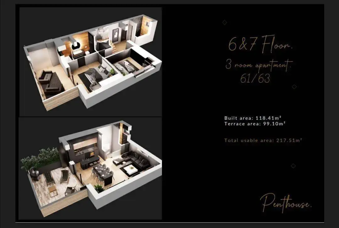 Duplexul, situat la etajele 6 și 7, este decomandat și dispune de 2 grupuri sanitare și o suprafață utilă de 90 mp, completată de 2 terase generoase de 100 mp. Va fi livrat complet finisat, cu materiale premium, inclusiv: