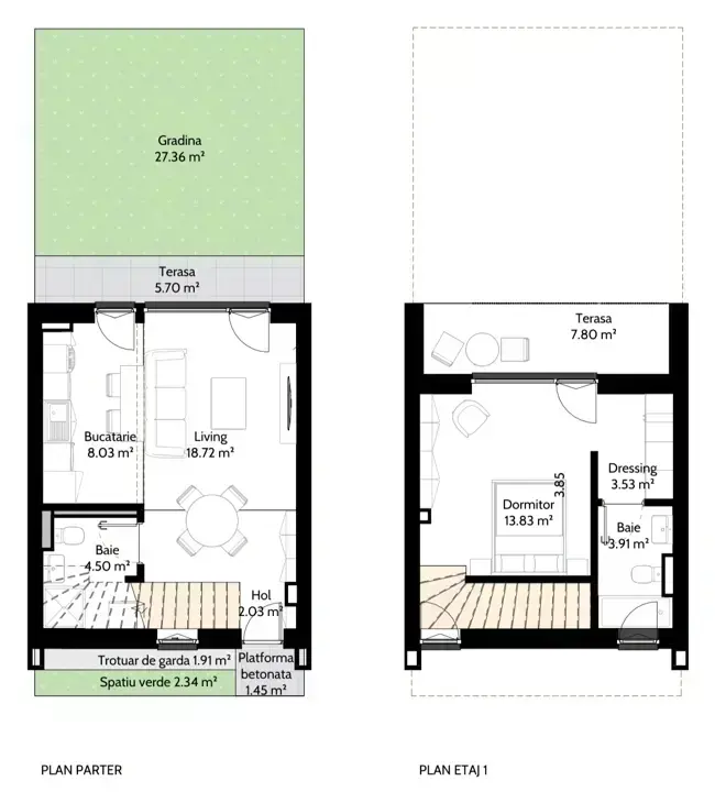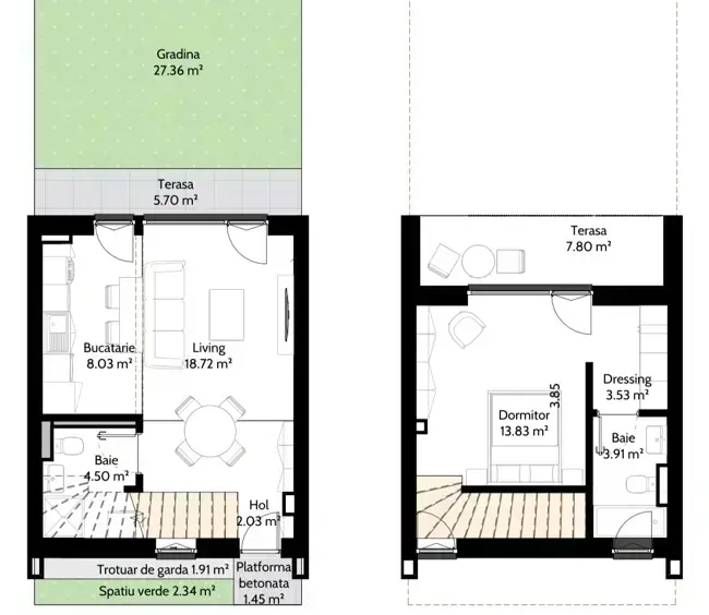 O locuință pe două niveluri, cu grădină și două terase – perfectă pentru o familie la început de drum.