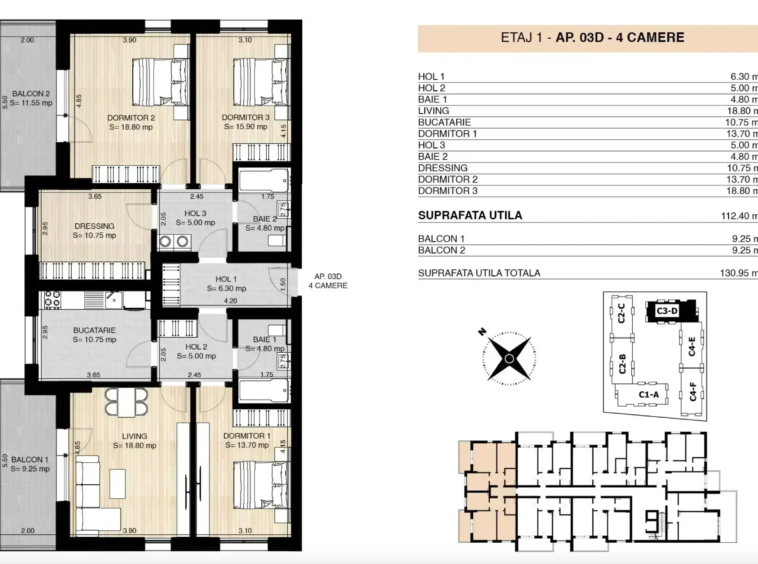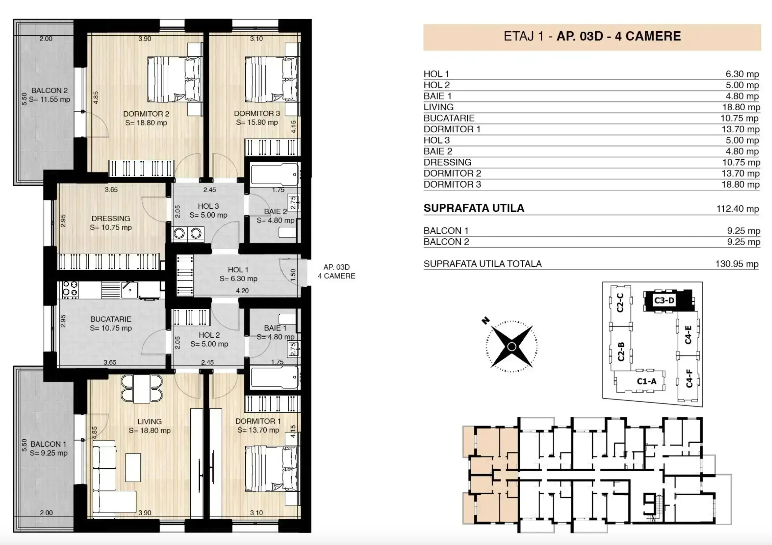Suprafață utilă de 130,95 mp, din care 2 balcone generoase de 18,50 mp
