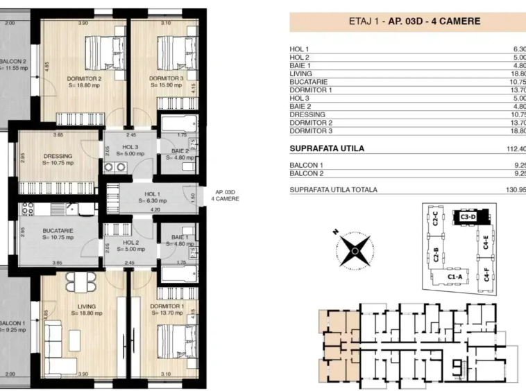 • Suprafață totală de 112 mp utili, completată de un balcon generos de 18 mp