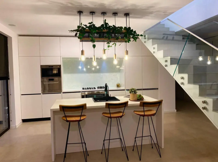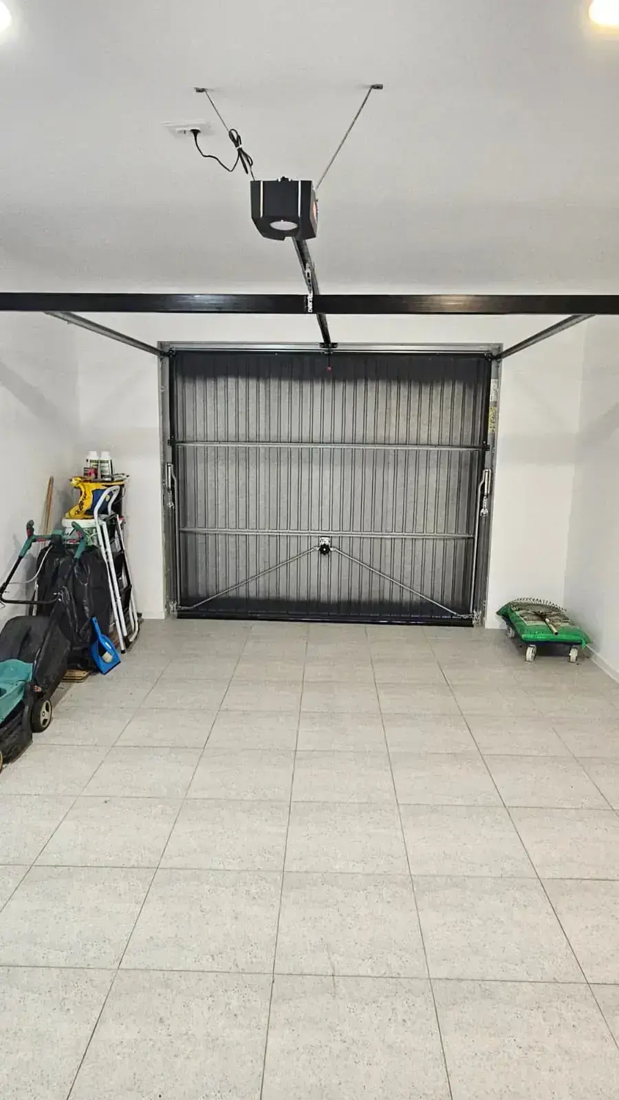 Parterul dispune de un living spațios integrat cu zona de dining, o bucătărie deschisă complet echipată cu electrocasnice Fulgor, Franke și Bosch, un garaj cu ușă automată, o baie modernă, un spațiu tehnic și o terasă de 32 mp cu acces direct la o grădină atent amenajată.
