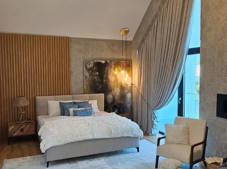 La etaj, dormitorul matrimonial impresionează prin baia privată, dressingul generos și tavanul de 6 m, fiind completat de două dormitoare secundare, fiecare cu balcon propriu, o baie comună și o terasă spațioasă pentru momente de relaxare.